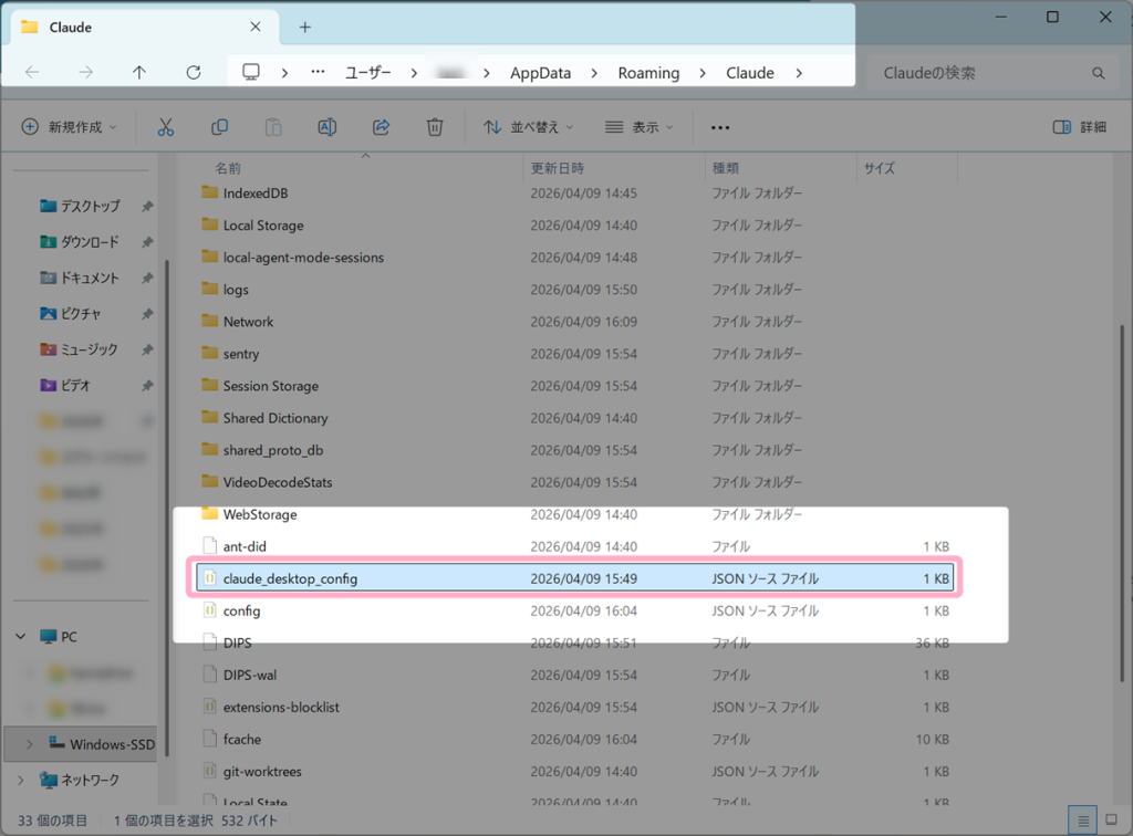 4.エクスプローラーが立ち上がり「claude_desktop_config.json」の保管場所が参照されます。