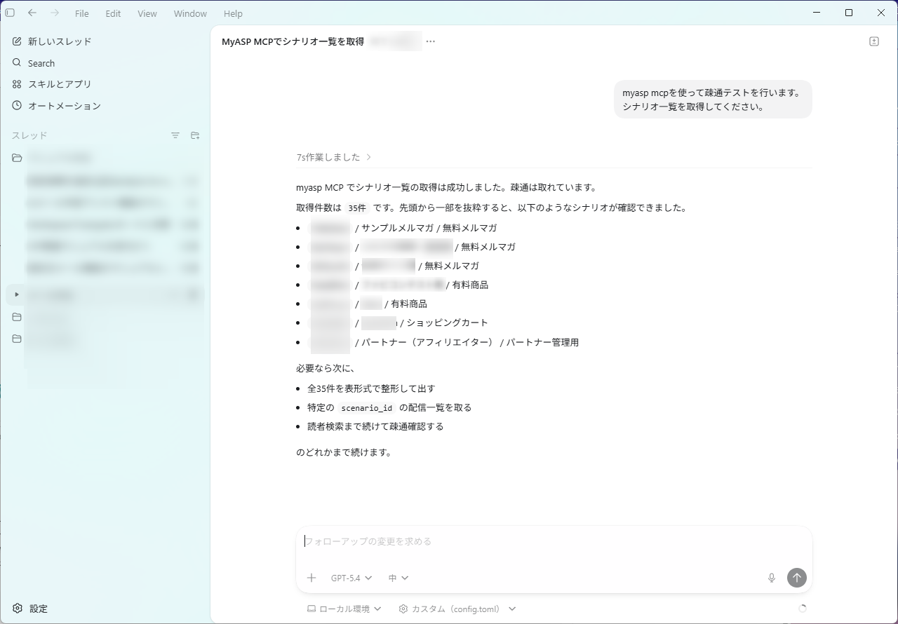 MyASP MCP が利用できるか確認してMyASPのシナリオ一覧を取得して2.シナリオ一覧やMyASP上の情報が取得できることを確認します。