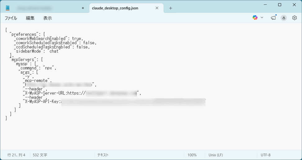 5.「claude_desktop_config.json」に、MyASP管理画面上で発行したClaudeDesktop用の接続設定を入力します。