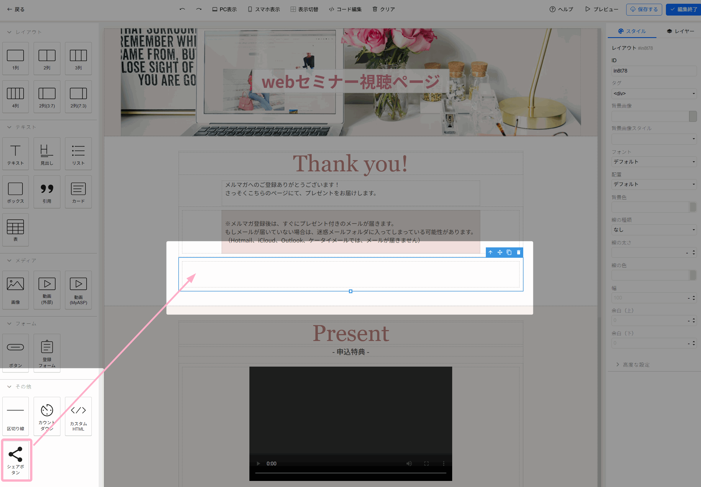 シェアボタンを設置したい箇所を決め、ドラッグ&ドロップで挿入します。