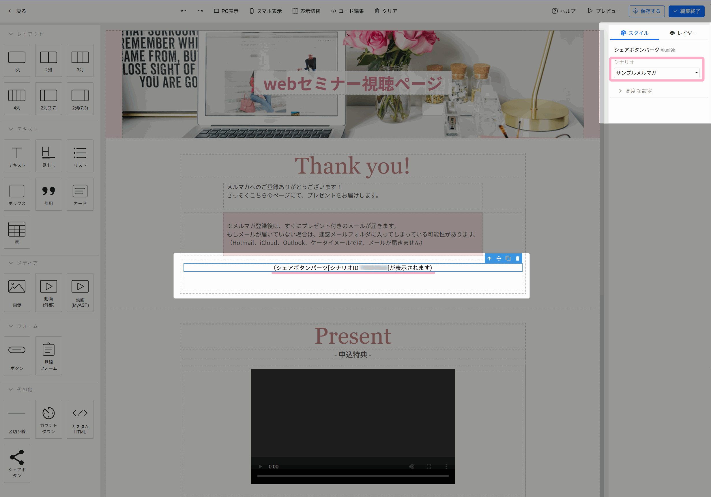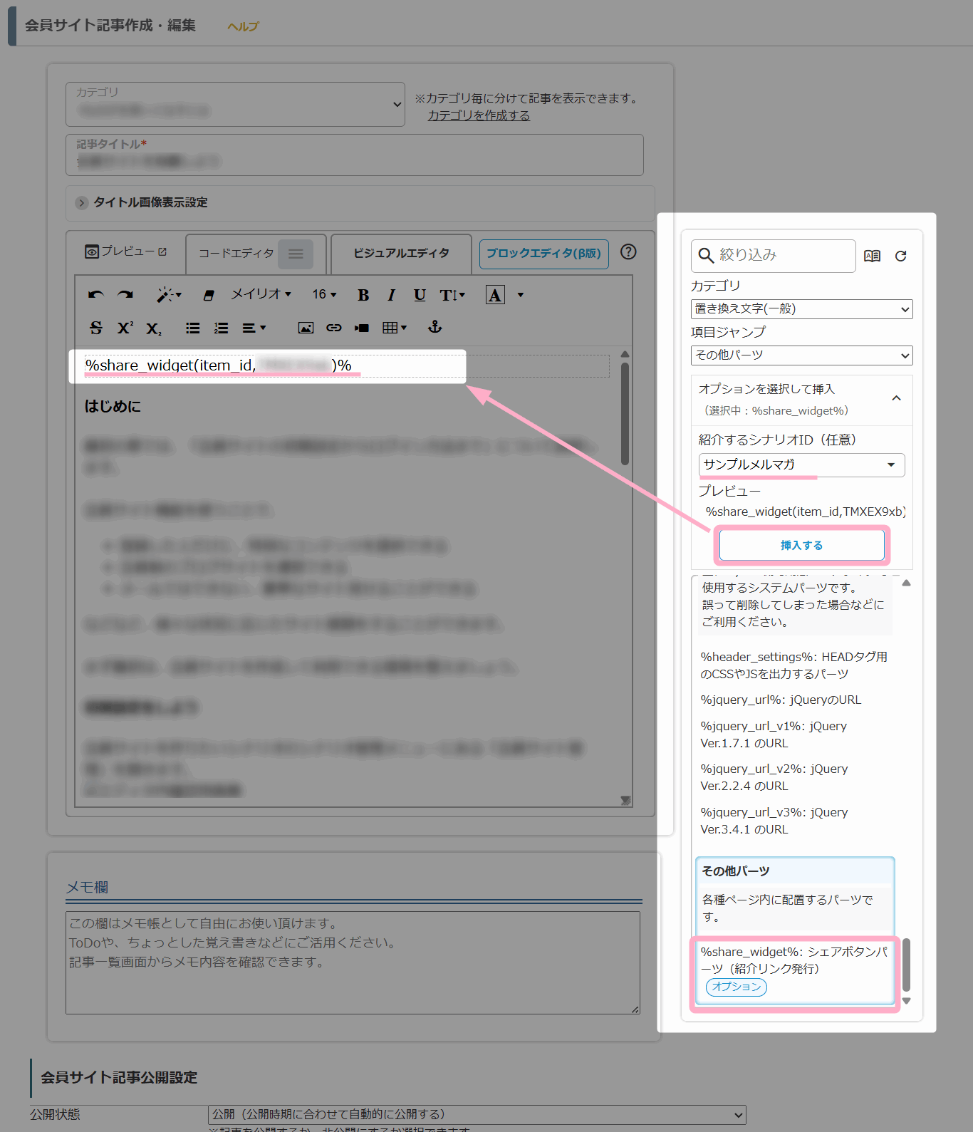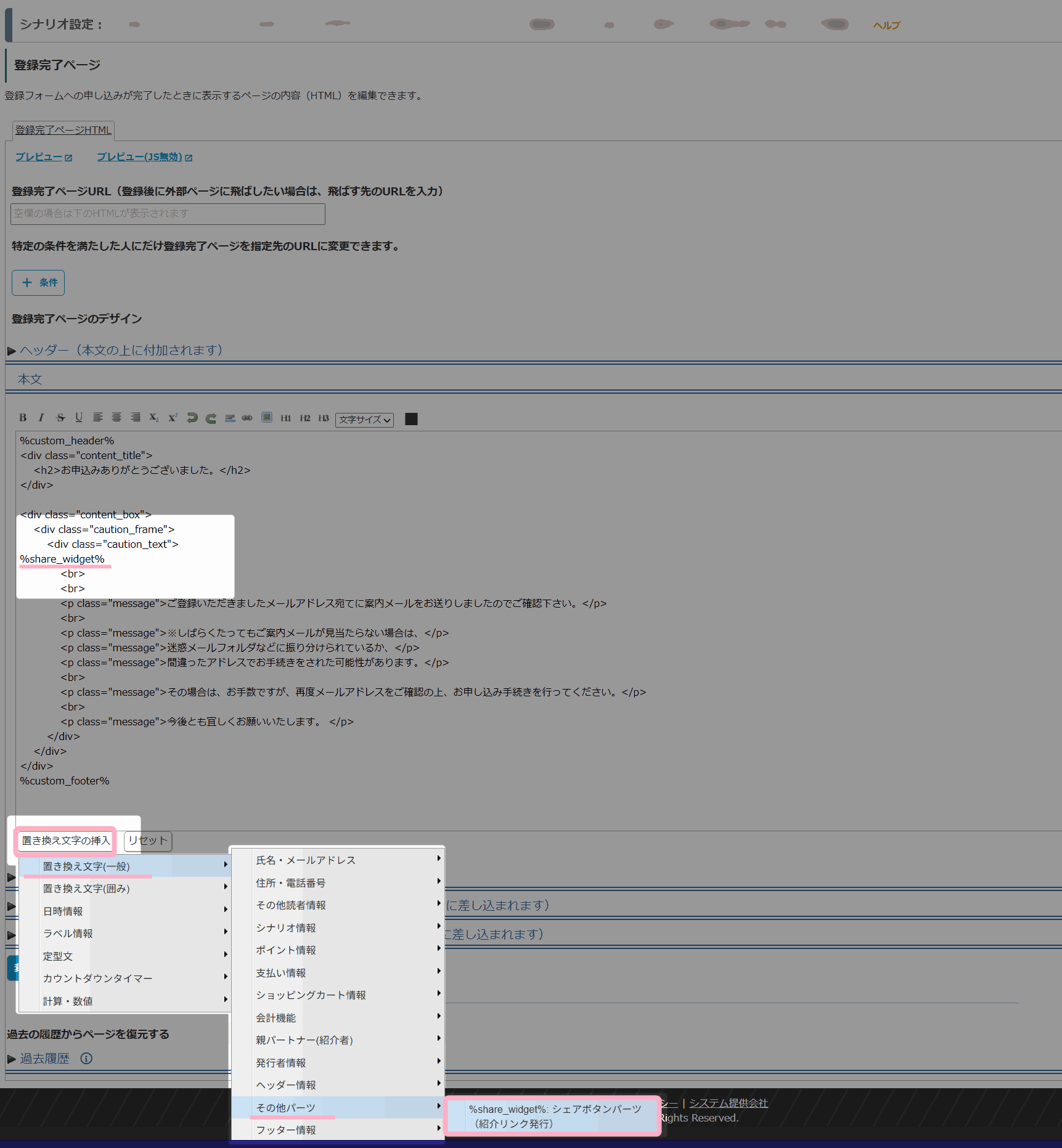 から、「%share_widget%」(シェアボタンパーツ:紹介リンク発行)の置き換え文字を挿入します。