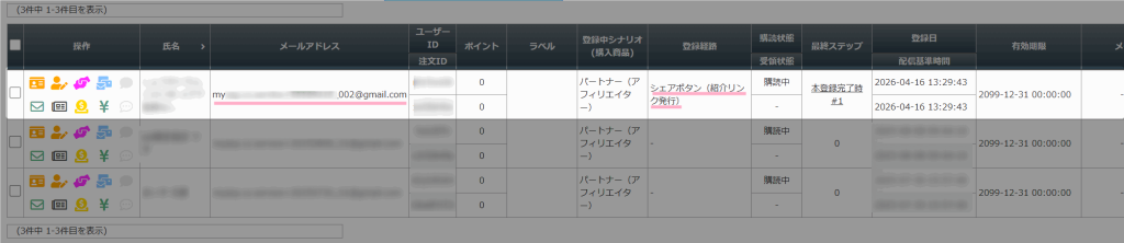 シェアボタン経由でメールアドレスを入力して紹介リンクを発行したユーザーは、設定した「パートナー管理用シナリオ」へ自動登録されます。