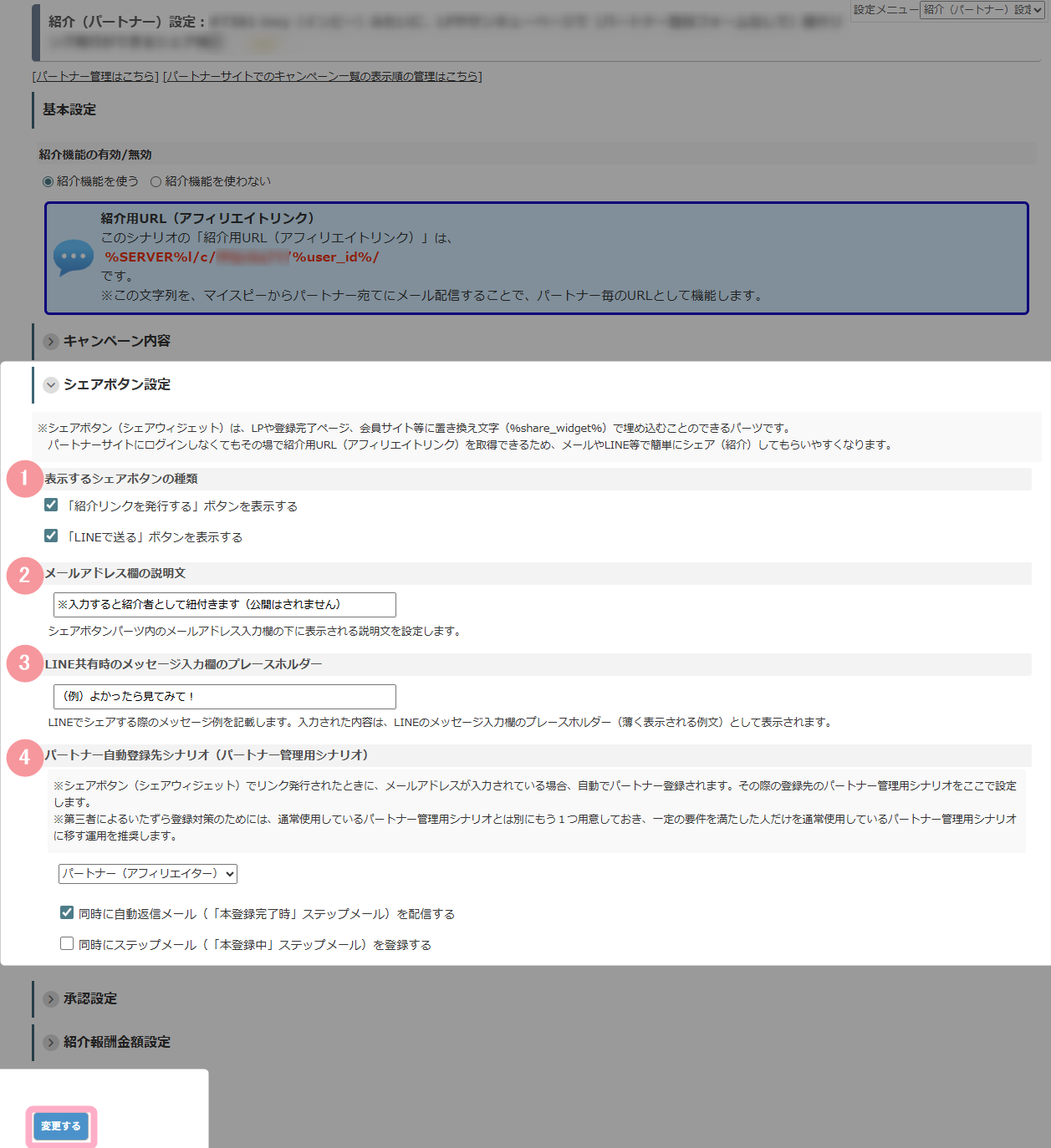 表示するボタンの種類、メールアドレス欄の説明文、LINE共有時のプレースホルダー、パートナー自動登録先シナリオなどは、紹介(パートナー)設定画面の「シェアボタン設定」で設定してください。