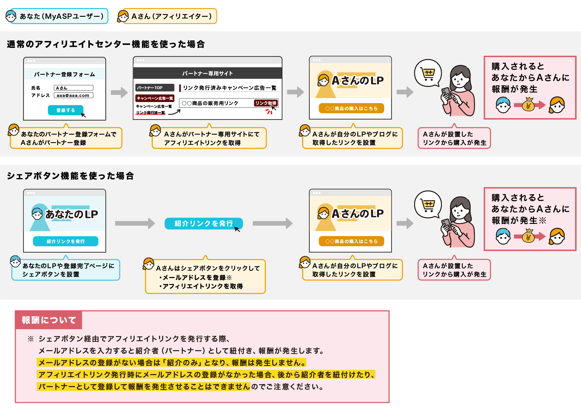 後からパートナー登録をしても、過去にシェアボタンで発行した紹介リンク経由の紹介情報は紐づけできません。 - シェアボタン経由での紹介リンク発行でアフィリエイト報酬も発生する運用を行ないたい場合は、シェアボタンを利用するユーザー向けにメールアドレス登録を促す文言や、メールアドレスを入力せずに発行した場合は紹介報酬の対象にならないことが分かる案内を、掲載ページや説明文に明記することをおすすめします。