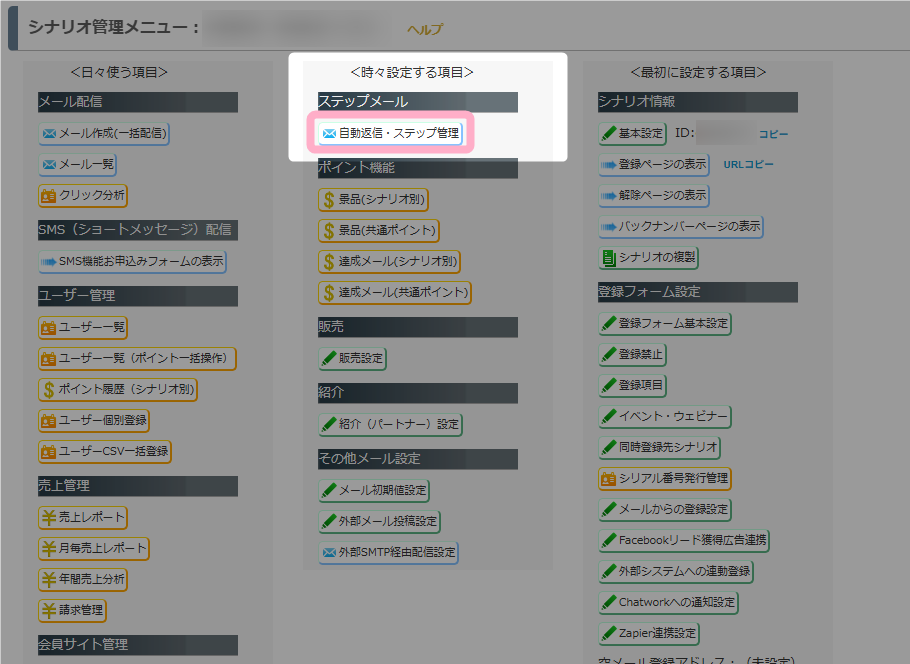 シナリオ管理メニュー > 自動返信・ステップ管理