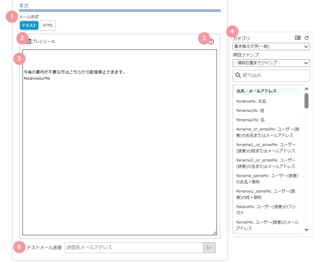 | 4 | 置き換え文字挿入パネル | 置き換え文字をクリックすることで本文内に挿入することができます。 参考:機能解説:置き換え文字 |