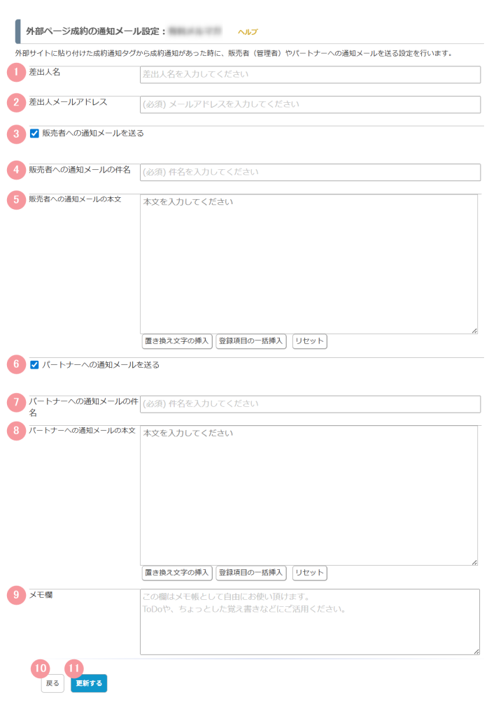 | 5 | 販売者への通知メールの本文 | ※「販売者への通知メールを送る」にチェックを入れている場合のみ表示されます 販売者へ配信する通知メールの本文を入力します。 |