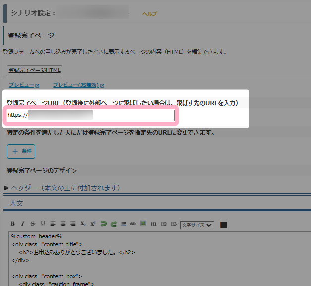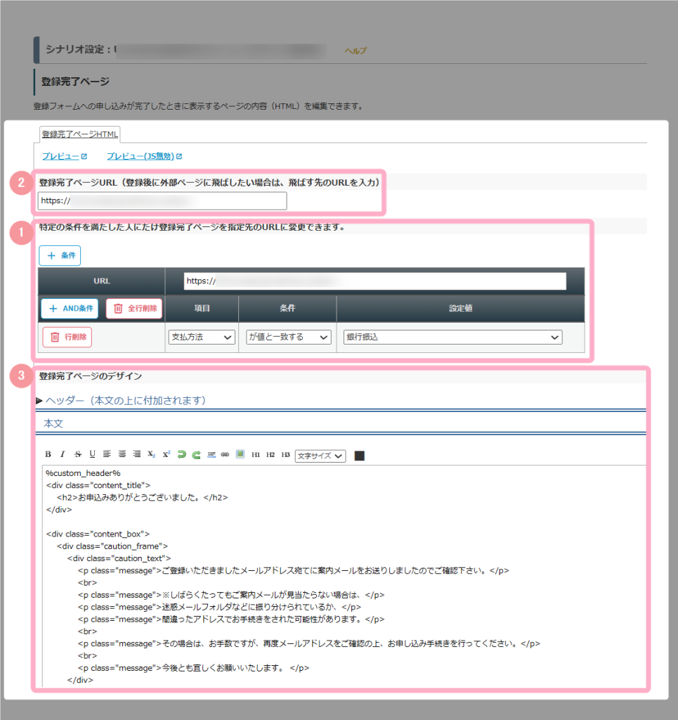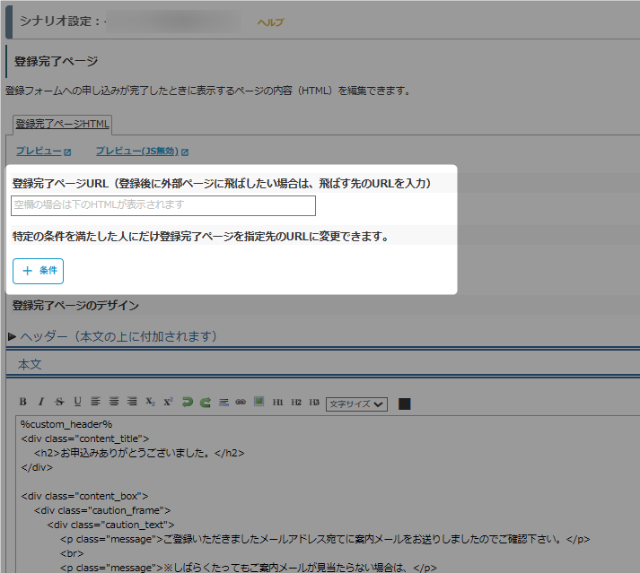 シナリオ管理メニュー > 登録完了ページ設定