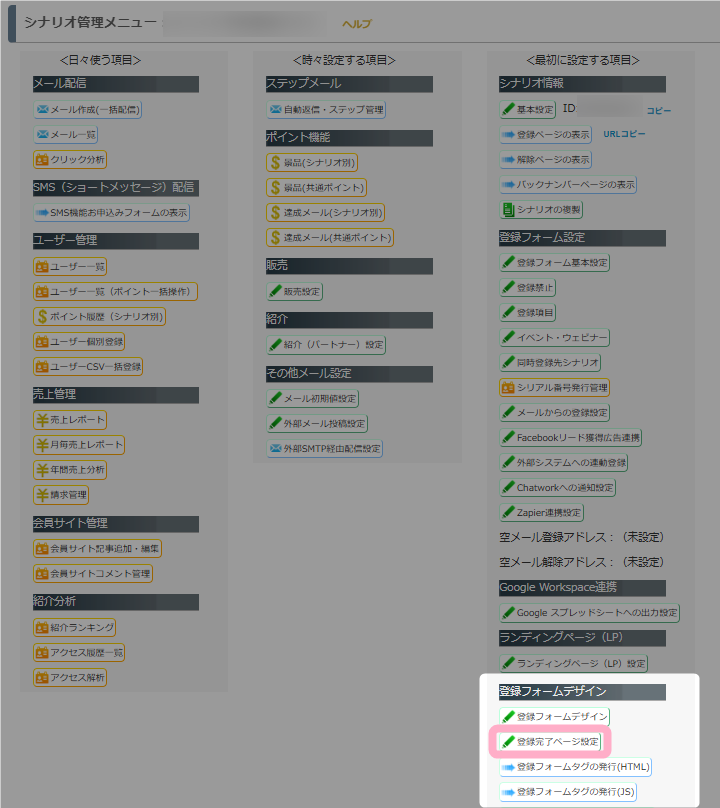1.シナリオ管理メニュー > 登録完了ページ設定 をクリックします。