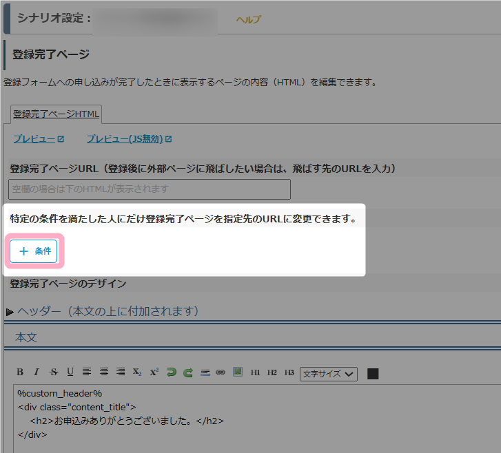 2.「特定の条件を満たした人にだけ登録完了ページを指定先のURLに変更できます。」の下部にある「+条件」をクリックします。