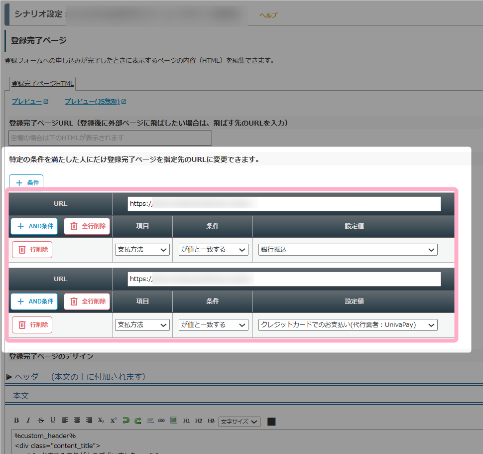 このように設定することで、登録フォームでユーザーが選択したお支払方法等によって異なるページに遷移させることができます。