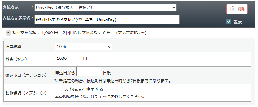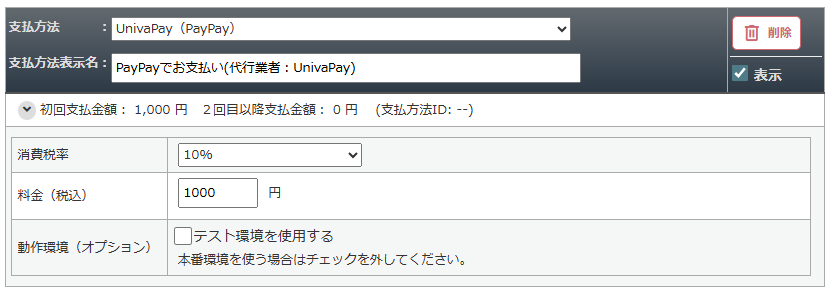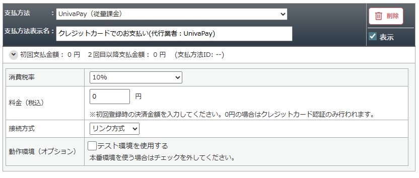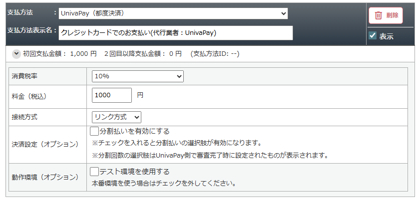 支払方法で「UnivaPay(都度決済)」を選択します。