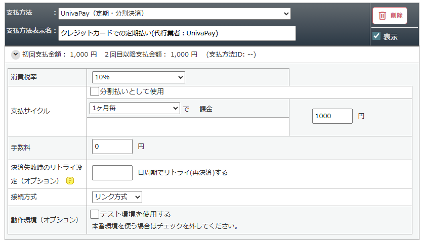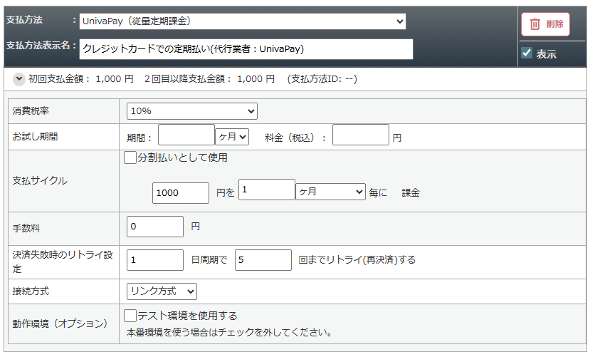 | 手数料 | 初回支払い時にのみ上乗せされる金額を設定できます。 マイナスで金額を指定すると初回支払い時から金額を差し引くこともできます。 参考:定期決済で、初回決済時のみ金額を変更することはできますか? |