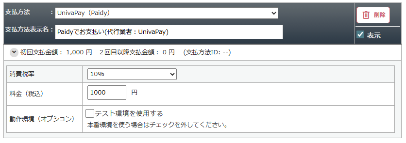 支払方法で「UnivaPay(Paidy)」、「UnivaPay(Paidy従量課金)」、「UnivaPay(Paidy従量定期課金)」のいずれかを選択します。