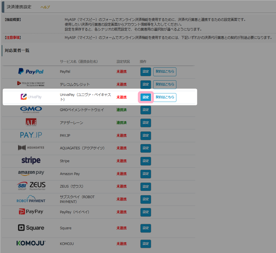 2.「決済連携設定」画面の対応業者一覧から、UnivaPay(ユニヴァ・ペイキャスト)設定の「設定」をクリックします。