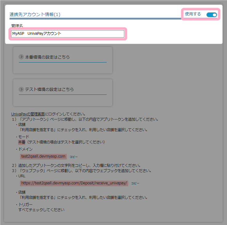 そのうえで、前述の本番環境と同様の方法で、アプリトークンとシークレットの設定、またUnivaPayの管理画面側でウェブフックの追加を行います。