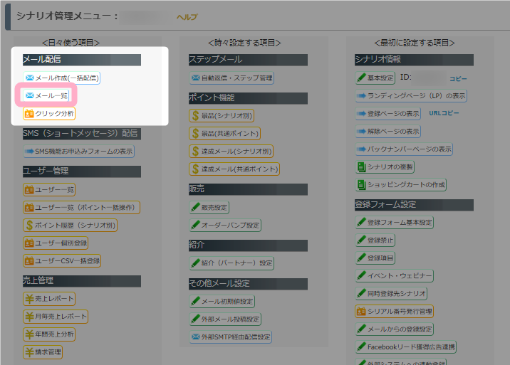 1.シナリオ管理メニュー > メール一覧 をクリックします。