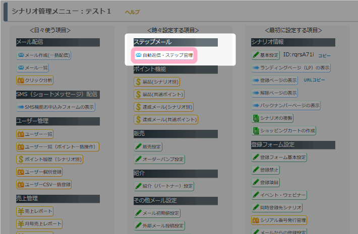 シナリオ管理メニュー > 自動返信・ステップ管理