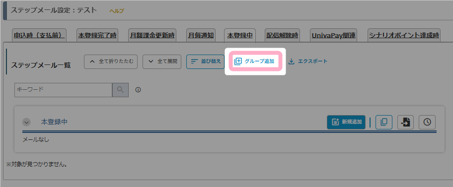 2.「本登録中」タブのステップメール一覧にて、「グループ追加」をクリックし、ステップメールを追加するためのグループを作成します。
