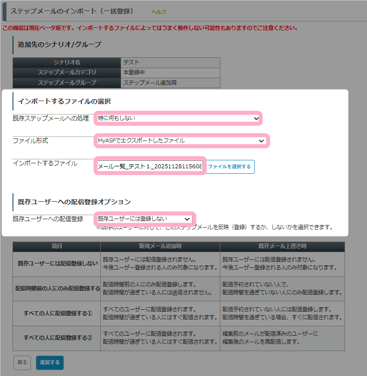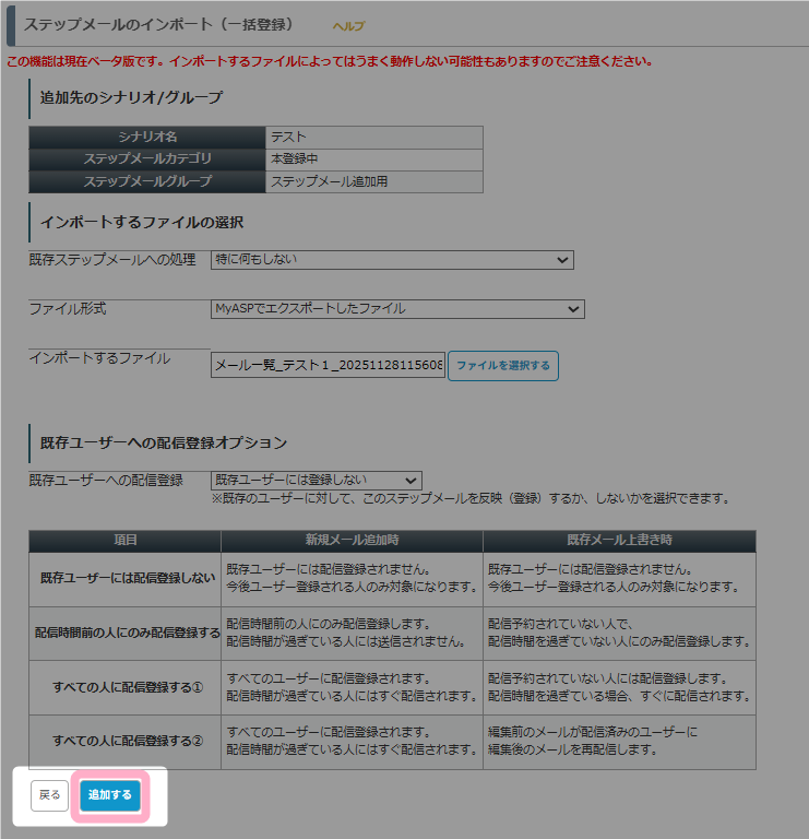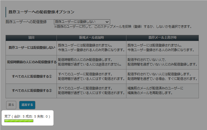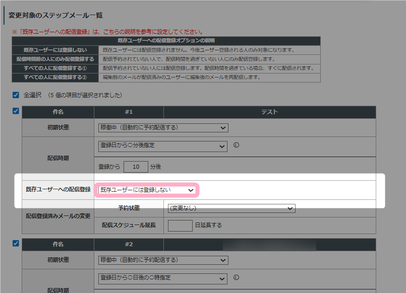 参考:ステップメール編集時の「既存ユーザーへの配信登録オプション」の動作について教えてください