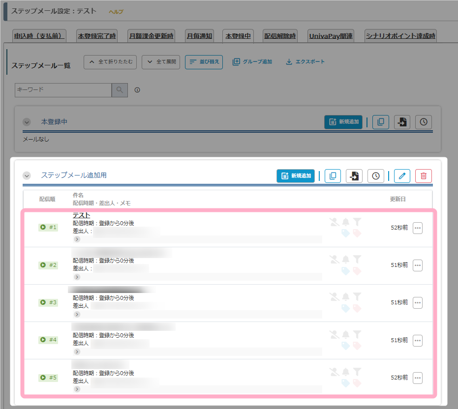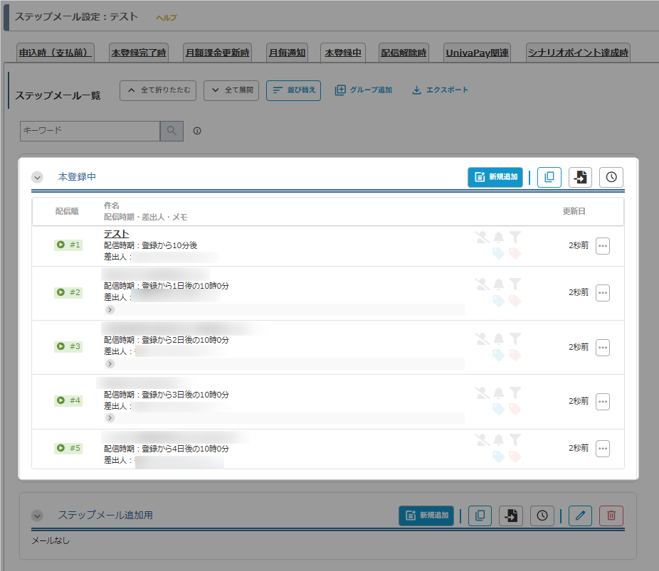 例えば、配信時期は追加されたすべてステップメールについて、初期値の「登録から0分後」に設定されます。