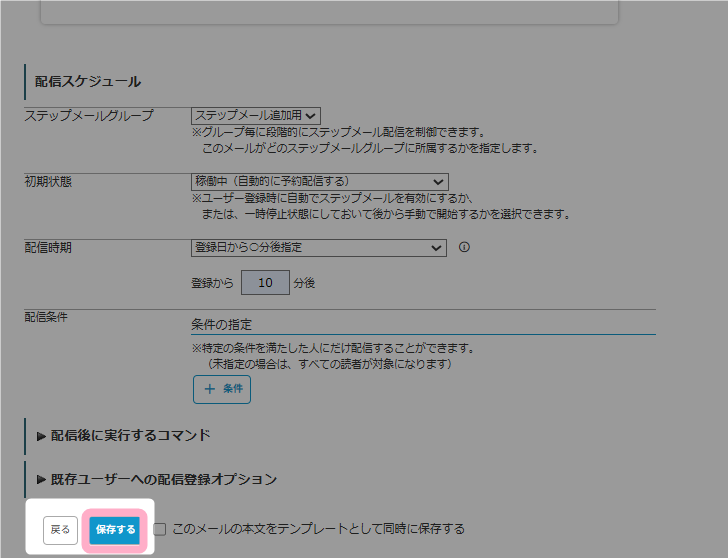このように設定することで、配信済みの一括配信メールをステップメールとして追加し、今後登録されるユーザーに対して追加したステップメールを配信することができます、