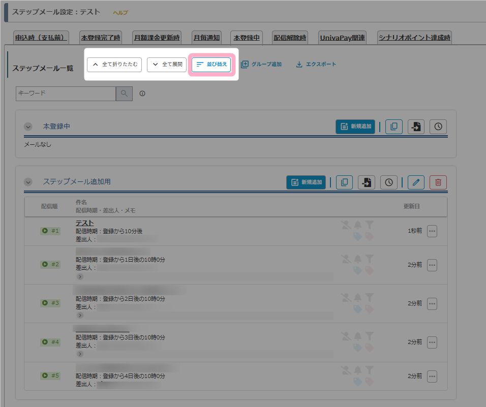 2.各ステップメールの設定が完了したら、ステップメール一覧の「並び替え」をクリックします。
