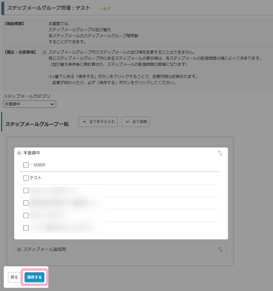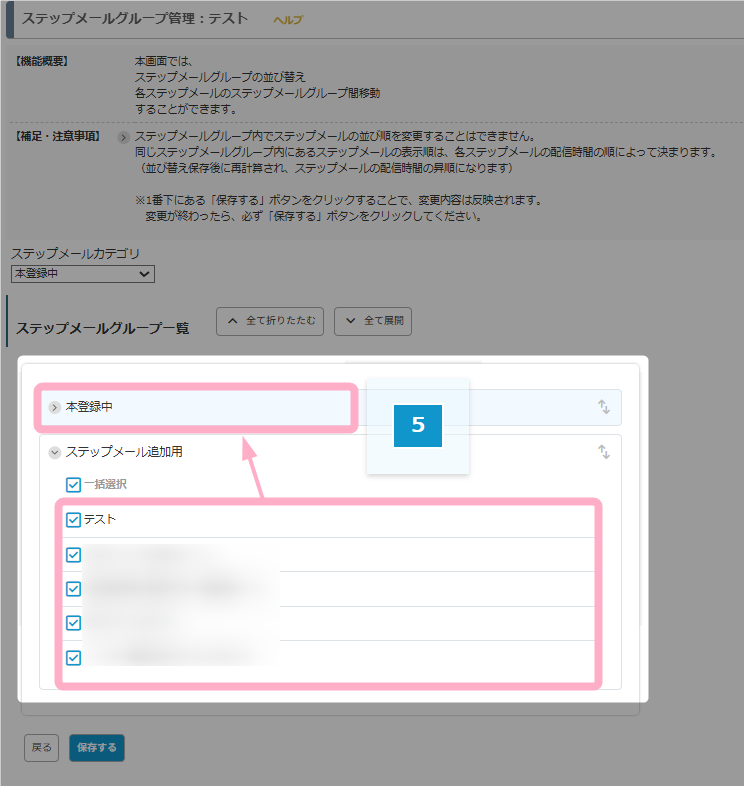 3.「ステップメール追加用」グループ内の全てのステップメールにチェックを入れ、「本登録中」グループにドラッグ&ドロップして移動します。