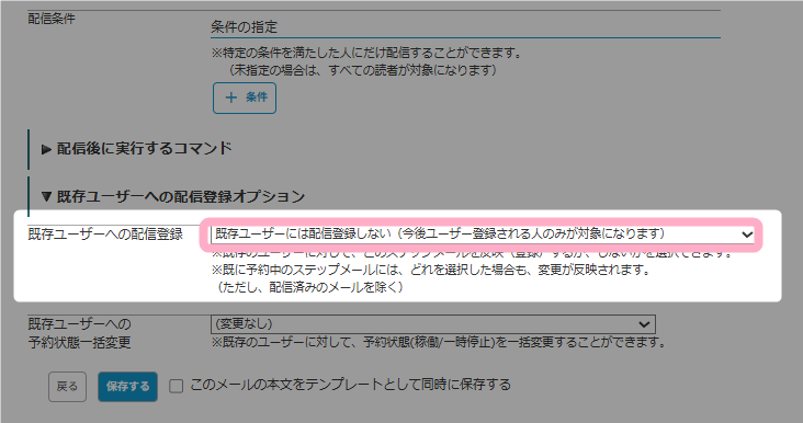 のいずれかから、既存ユーザーにステップメールを配信予約するよう適宜「既存ユーザーへの配信登録」の設定を変更してください。