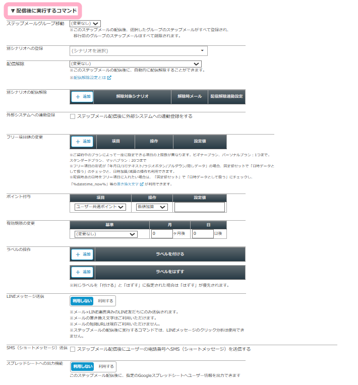 メール作成・編集画面の「配信後に実行するコマンド」では、メールが配信されたタイミングで同時に実行するコマンドを設定することができます。