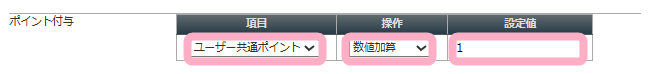 ポイント付与を設定したい場合は、項目(付与したいポイントの種類)・行いたい操作・設定値(ポイント数)を設定します。