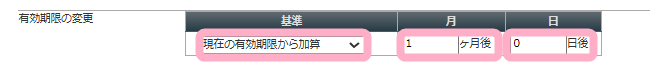 有効期限を変更したい場合は、基準(どの日時を起点に有効期限を変更するか)・延長したい月数と日数を設定します。