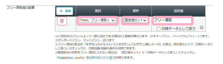 フリー項目値の変更を設定したい場合は、項目(設定したいフリー項目)・行いたい操作・設定値を設定します。