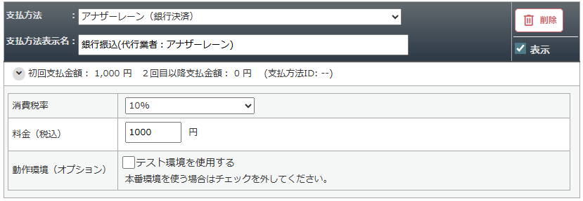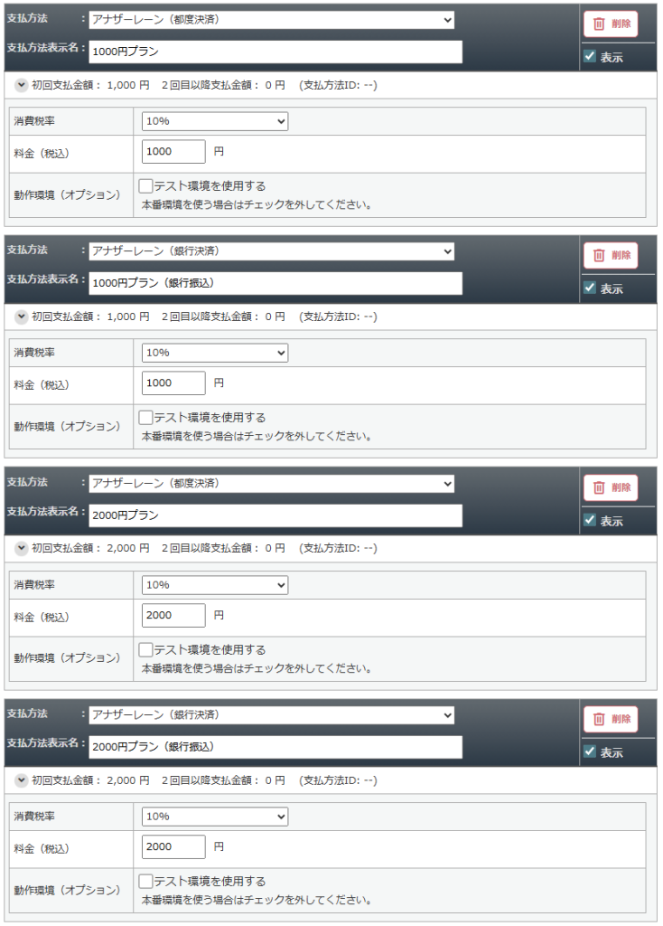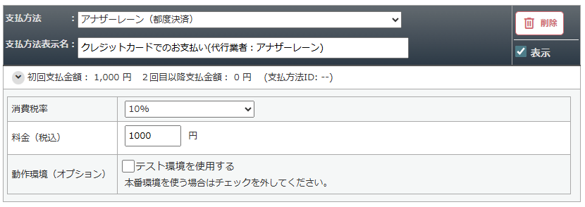 支払方法はクレジットカードと銀行振込をセットで追加し、料金は必ず同じ金額を設定してください。