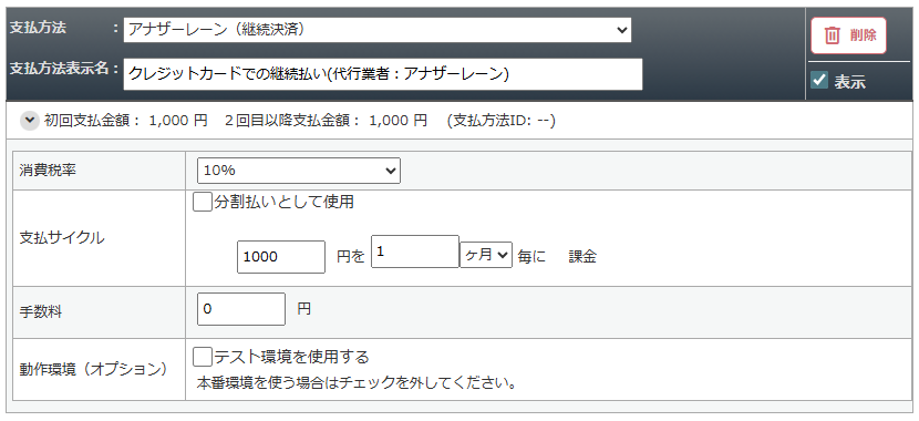 | 手数料 | 初回支払い時にのみ上乗せされる金額を設定できます。 マイナスで金額を指定すると初回支払い時から金額を差し引くこともできます。 参考:定期決済で、初回決済時のみ金額を変更することはできますか? |